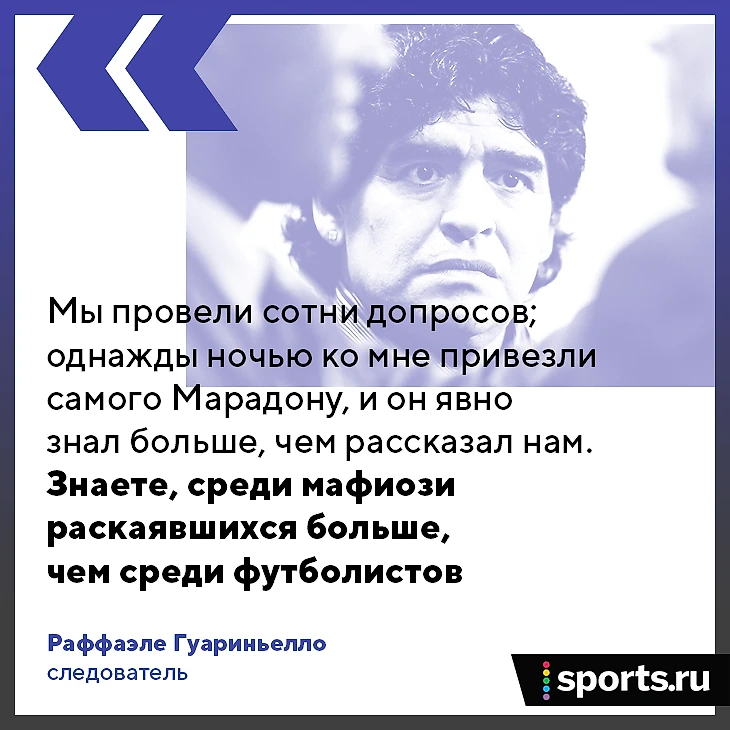 «Десятки подозрительных смертей, жалобы вдов игроков, таинственные болезни (футболисты «Фиорентины» Бруно Беатриче, Нелло Салтутти и Уго Ферранте не дожили до 60, у Массимо Мантолини отказала почка, Адриано Ломбарди заболел БАС, Джузеппе Лонгони был парализован – Sports.ru). Мы провели сотни допросов; однажды ночью ко мне привезли самого Марадону, и он явно знал больше, чем рассказал нам. Знаете, среди мафиози раскаявшихся больше, чем среди футболистов».