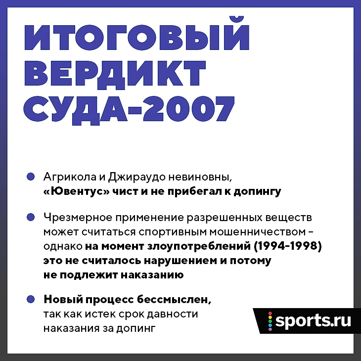 В ноябре 2004-го «Ювентус» признали виновным в применении ЭПО с 1994 по 1998 годы. Гендиректор Антонио Джираудо был полностью оправдан. Врач Риккардо Агрикола получил 22 месяца тюрьмы и заплатил 2000 евро штрафа. Фармацевт Джованни Россано, продававший препараты по поддельным рецептам, признал вину и пошел на сделку со следствием – его посадили на 5 месяцев.