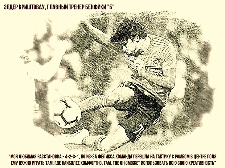 - наилучший тактический вариант для Феликса: пара нападающих по принципу «статичный/подвижный», где можно действовать по орбите ударного форварда. Такая модель «Бенфики» позволяла Феликсу подстраиваться и мобильно работать на созидание, объем моментов и свободных зон основного нападающего (Сеферовича либо Жонаса). Так называемая «внутренняя химия» в рамках дуэта нападающих приобретает важнейшее значение. Феликсу необходимо выполнять свою часть тактической задачи, не провоцируя «конфликт в зонах», иногда располагаясь по диагонали или на разной высоте с тем же Сеферовичем. В этом плане показателен крайне неубедительный дебют Жоау за национальную сборную в игре против Швейцарии: юный форвард редко встречался с мячом, не понимая механизмов взаимодействий в группе атаки, действуя изолированно и включаясь эпизодически. Здесь речь может идти не только о понятном дебютном волнении, но и об отсутствии элементарных знаний о том, как правильно подстраиваться под движение слабо изученных пока партнеров по сборной;