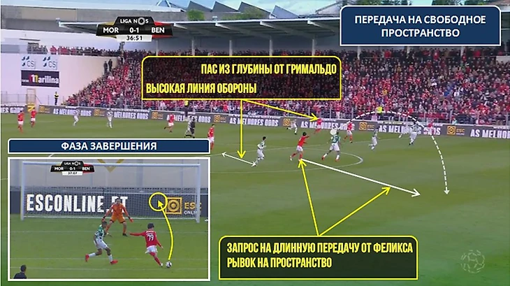 В следующей ситуации свободна не просто небольшая зона, высота линии обороны соперника позволяет Гримальдо просто вбросить мяч на пространство с целью устроить соревнование в скорости и проворности между Феликсом и защитником (предварительный жест Жоау в виде поднятой руки прилагается):