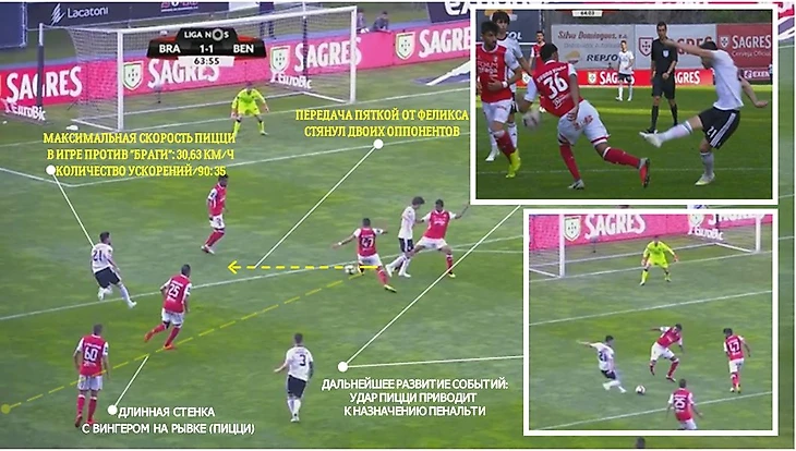 Говоря о взаимодействиях внутри группы атаки, не стоит зацикливаться исключительно на ударном форварде-напарнике. Не менее интересна архитектура взаимосвязей Феликса с двумя другими непосредственными помощниками по группе атаки: Пицци и Рафой, среднескоростными, но очень креативными «узкими» вингерами «Бенфики». К ним Феликс «спускается» за комбинациями и численным преимуществом в полуфланговых зонах. Стоит отметить, что оба основных варианта на флангах (Пицци и Рафа) – одни из лучших игроков не только в своем амплуа, но и вообще во всем чемпионате. Вот пример длинной стенки, стартовавшей в полуфланге передачей от Пицци и продолженной рывком под обратный пас (передача-штрих пяткой от Феликса):