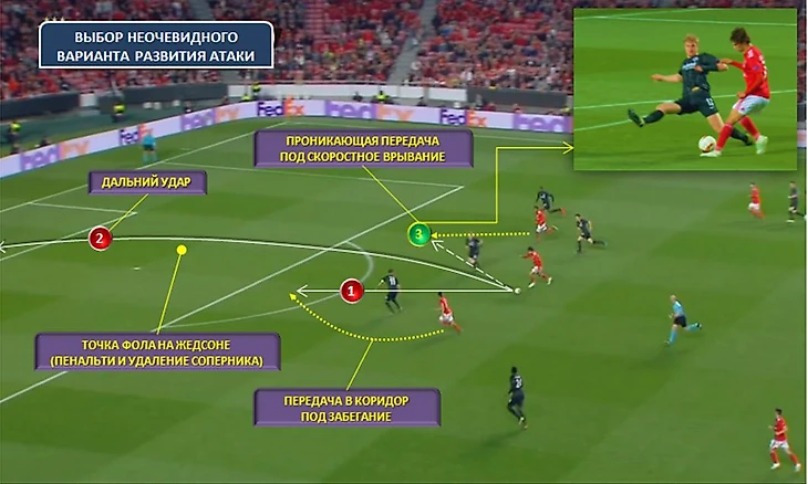3 варианта развития атаки, Жоау выбирает сложнейший из них: обратите внимание на получающего мяч Сеферовича, он показывает на зону свободного пространства. Феликс отказывается от промежуточных решений, а техника позволяет исполнить мягкий наброс-парашют над линией обороны. Хорошая связь с напарником, изучение его манеры (суммы его движений, открываний, технических ограничений) – это та картина, которую можно будет пытаться воссоздать на уровне нового клуба.