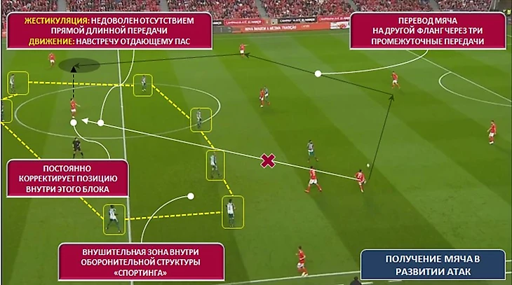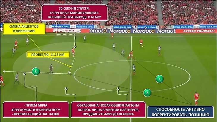 Важно отметить и весь тот объем предварительного движения в образующихся свободных зонах. Португалец активно меняет позицию, зону, высоту на игровом поле, подстраиваясь под движение мяча и партнеров: