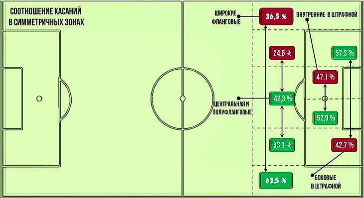 Зона перед штрафной площадью (опорная соперника или пространство непосредственно за спиной опорников) разделена не на два, а на три сегмента - центральный и два полуфланговых. Основной крен в объеме получений: в атаке Феликс действует правее центральной оси поля, в правом полуфланге и чаще смещается в ширину пространства правого фланга.