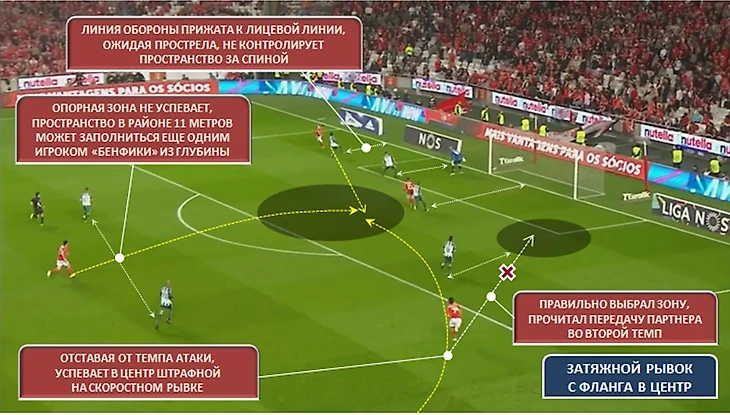 Своевременная остановка внутри пятиугольника пространства, подготовка к приему передачи, изменение языка тела под удар в касание, гол. Это лишь один пример атаки вторым темпом с реализацией образовавшейся свободной зоны. Вот следующий эпизод, где после фланговой атаки линия обороны соперника в полном составе «прилипает» к лицевой линии, оставляя огромную «слепую» (неконтролируемую) зону в своем тылу: