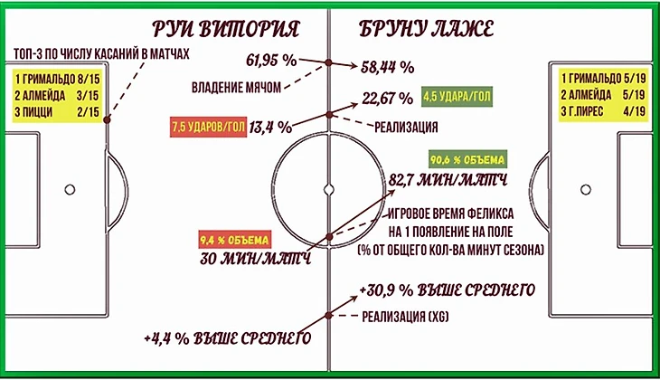 Нельзя не отметить тот факт, что по ходу сезона в «Бенфике» сменился тренер (Руи Виторию сменил Бруну Лаже), раздробив сезон на две практически равные части. Так получилось, что дебютировал и первый объем игровых минут Феликс получил при Витории, но это были лишь эпизодические появления. Во второй части сезона Жоау стал неотъемлемой частью основы «Бенфики», рывок команды к чемпионскому титулу совпал с увеличением роли нашего героя на отрезке при новом тренере. Сравнительные характеристики двух частей сезона «Бенфики» в чемпионате Португалии на изображении ниже: