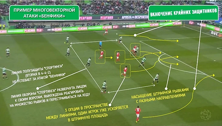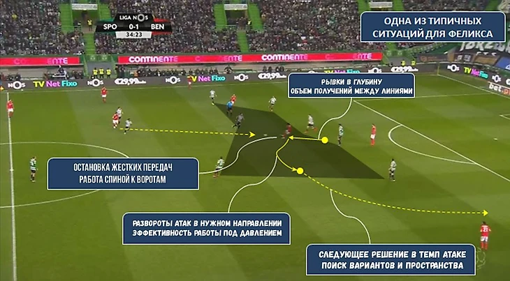Задача ударного форварда «Бенфики» – бежать за спину, задача Феликса во многих комбинациях и позиционных сценариях – бежать навстречу игроку с мячом с приемом и последующим продвигающим решением/умение создавать следующую линию передачи. Цель Жоау – генерировать объем получений и конвертировать это во что-то более опасное.