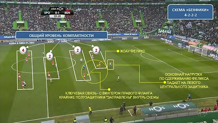 Действительно, подавляющего перевеса (за исключением, пожалуй, лишь широких фланговых) нет ни в одной из симметричных пар: Жоау зачастую дана возможность выбирать зону угрозы самостоятельно, активно перемещаясь внутри трети поля соперника. Но если кто-то из читателей привык к более простым обозначениям: чаще всего схема «Бенфики» выглядит как 4-2-2-2 (Сеферович/Жонас левее в роли классического форварда, Феликс – правее в паре нападающих с привилегией на активное перемещение).