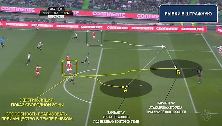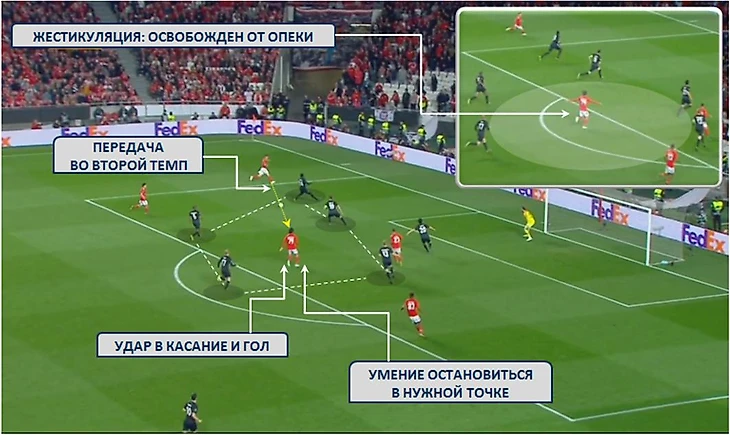 Еще один примечательный момент: по схеме именно Жедсон играл «под Феликсом» (единственным форвардом в 4-2-3-1). В данном моменте они поменялись не только позициями, но и функционалом (нападающий Феликс отдает тонкую передачу, «десятка» Жедсон врывается). Своеобразная тактическая «игра в наперстки» с разменами зон от молодого поколения «Бенфики». Важно не только наличие сразу двух активных опций на скоростных рывках, но и тот факт, что юный португалец прекрасно чувствует эти «входящие» в штрафную площадь варианты.