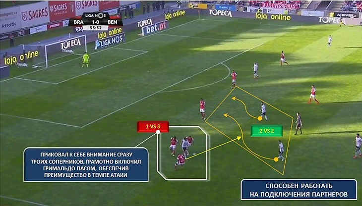 При этом в «Бенфике» осознают важность свободного перемещения форварда, его собственных интерпретаций свободного пространства и поиска взаимодействий с партнерами. Так было не только во второй половине сезона 2018/19, но и на предыдущем уровне иерархии в системе воспитания «Бенфики»: