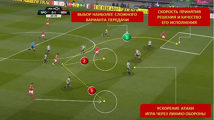 Через промежуточные передачи «Бенфике» удается довести мяч до своего форварда (хотя все перестроения Жоау в данной атаке выдают в нем скорее центрального полузащитника, чем нападающего). Дальше эпизод развивается по концепции «трех касаний»: остановка передачи первым, изменение баланса тела под следующую передачу вторым, проникающий пас на центрфорварда третьим. Теперь о пробеге, его объем указан не случайно. Хотя в современном футболе более важное значение имеют расстояние, преодолеваемое на рывках, или метраж на скорости выше определенной величины, после просмотра 10-12 матчей футболиста на минимальном временном промежутке картина беговой работы складывается четче, начинаешь немного точнее понимать из чего складывается этот объем, формализованный в итоговой цифре. Мелкие перемещения, корректирующие позицию, помощь фланговым игрокам и создание ситуаций, когда нужно добавиться в зону (банальные «+1»), отскоки по всем осям – та работа без мяча, которая не всегда видна человеку, не зацикленному на действиях одного конкретного игрока, смотрящему игру в панорамном формате или просто ради получения удовольствия и заряда эмоций (любимый автором тип просмотра).