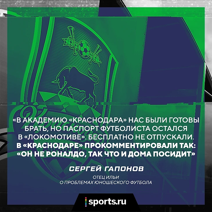 «В «Краснодар нас были готовы брать, но паспорт футболиста остался в «Локомотиве», – рассказывает Сергей Гапонов. – Когда обратились за паспортом, за Илью потребовали денег. В «Краснодаре» прокомментировали так: «Он не Роналдо, так что и дома посидит».