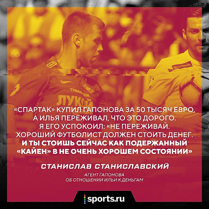Из-за проблем с деньгами Гапонов очень переживал, что за него надо платить компенсацию – 50 тысяч евро. Он считал, что это слишком большая сумма. Станиславский успокоил: «Илюх, не переживай. Хороший футболист должен стоить денег. И ты стоишь сейчас как подержанный «Кайен» в не очень хорошем состоянии».