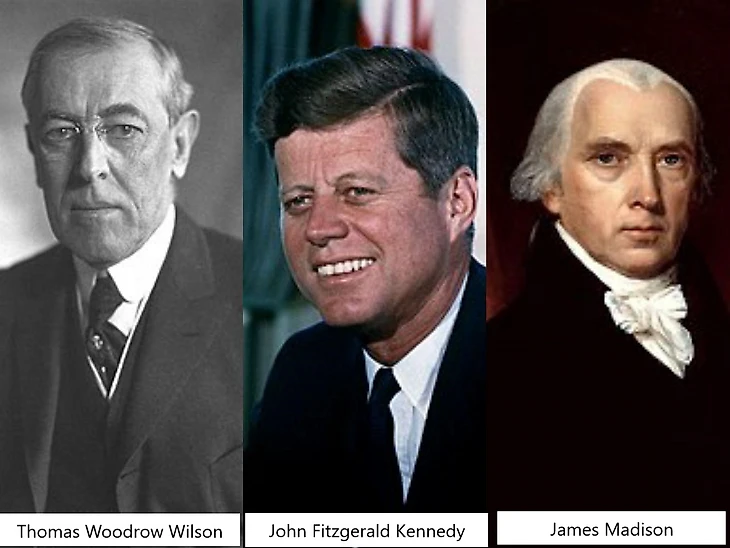Вудро Вильсон (1856-1924) был 28-м президентом США, лауреатом Нобелевской премии мира 1919 года. Джон Фицджеральд Кеннеди (1917-1963) был 35-м президентом США и одной из самых знаменитых политических фигур 20-го века. Джеймс Мэддисон (1751-1836) был 4-м президентом США, одним из авторов Конституции и Билля о правах.