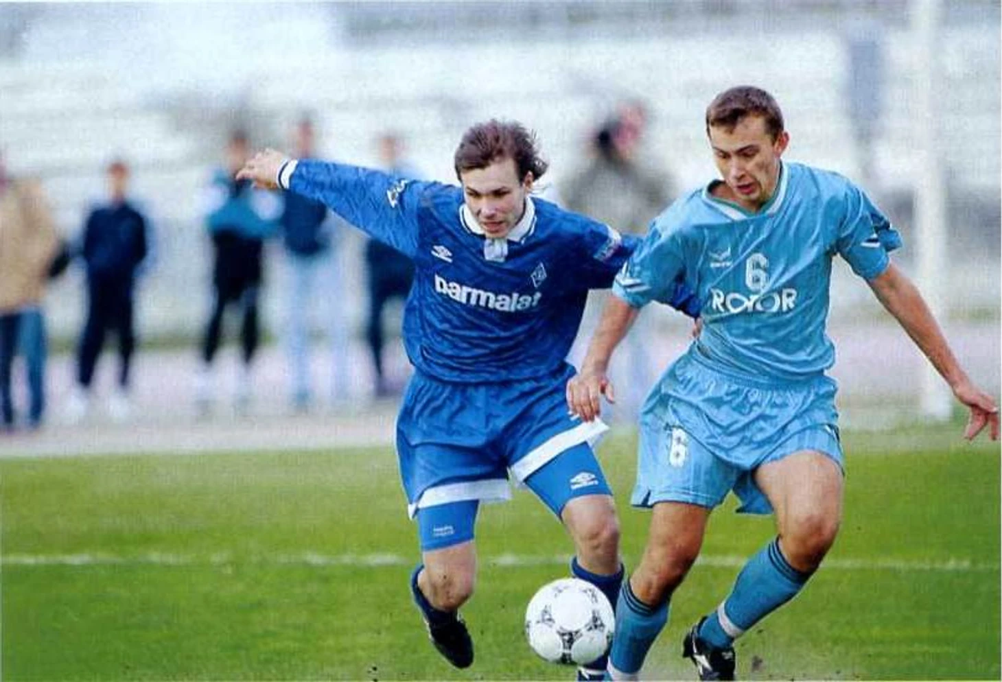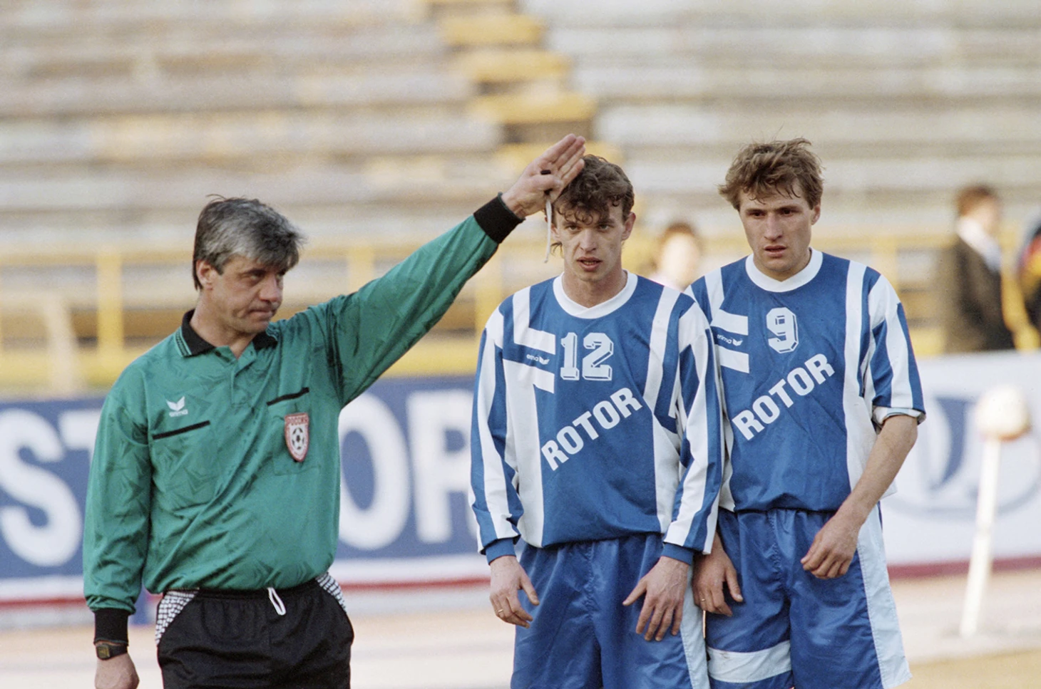 Форма сезонов 1996/97 от компании «Grand sport» из Тайланда. Именно в этой форме был бит грозный «Манчестер Юнайтед». На фото игроки «Ротора» Жуненко и Веретенников смотрят, что им скажет судья Ибрагимов.