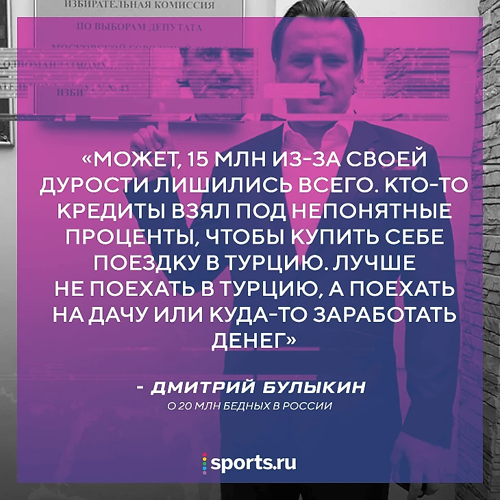 – И что дальше? Если бы мы дали им эти деньги, там пропали бы нищие? По доходам и расходам всегда такое было. У нас то же самое в футболе: какие у тебя доходы, такие должны быть и расходы. Если у тебя большой бюджет, то и деньги можешь тратить. Регионам тоже выделяют, но немного, потому что построить дорогу в регионе стоит в 10 раз дешевле, чем в Москве. В Москве все дороже. Москва большой город, он требует дорогого обслуживания. Но не поэтому бедные.
