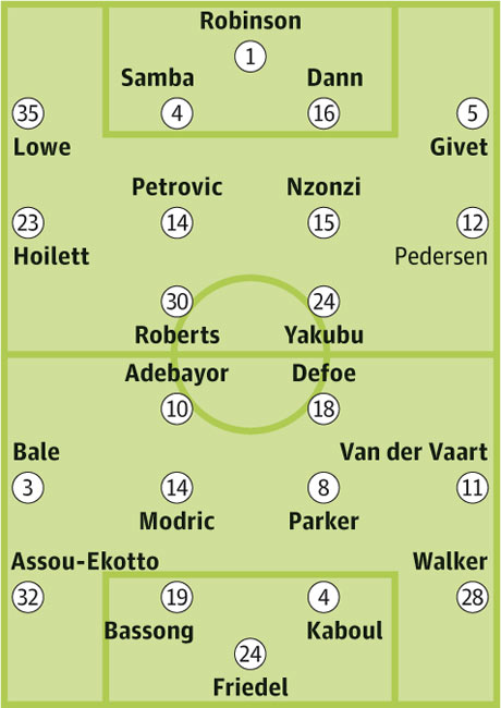 Запасные: Кудичини, Гомес, Фальке, Джованни, Роуз, Ливермор, Таунсенд, Павлюченко, Пинар, Сандро, Леннон, Кейн