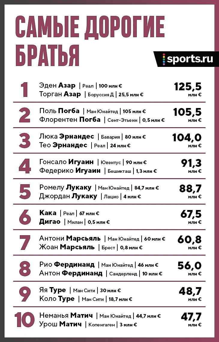 35 млн за переход Эдена из «Лилля» в «Челси» не учитывались – иначе преимущество получили бы братья, которые чаще меняли клубы. Только максимальная сумма и никакой рыночной стоимости.