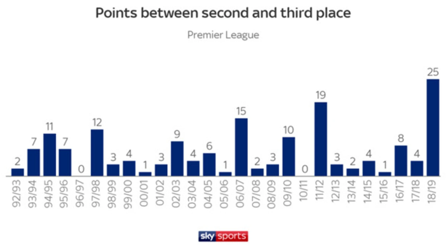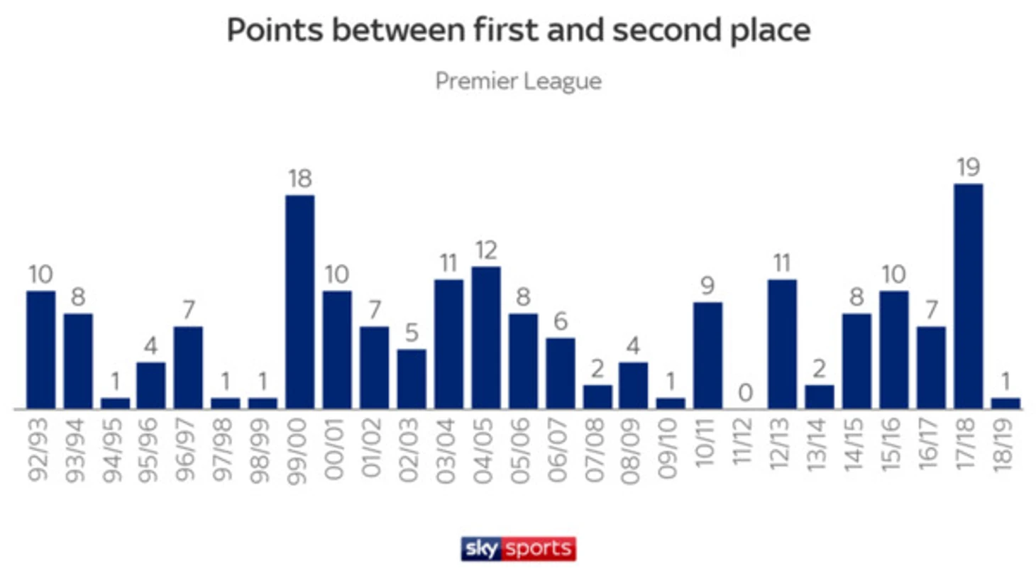 За время существования Премьер лиги, таких случаев, чтобы претенденты на титул были разделены всего одним очком или меньше, было всего пять, этот сезон стал шестым.