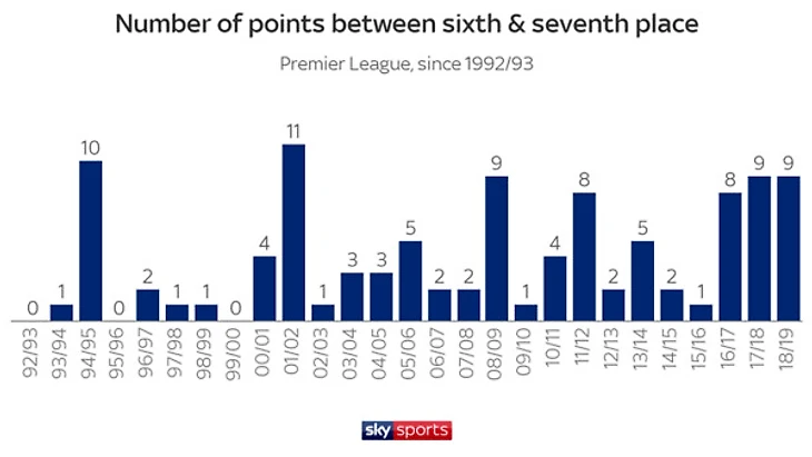 Раз уж мы заговорили об отрывах, то есть смысл вспомнить и ту пропасть, которая образовалась между шестым и седьмым местом. Если раньше в АПЛ была "большая четверка", то сейчас ей на смену пришла "большая шестерка", в лице "Ман Сити", "Ливерпуля", "Челси", "Тоттенхэма", "Арсенала" и "МЮ".