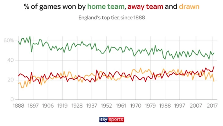 В этом сезоне была отмечена самый высокий процент гостевых побед за всю историю существования Футбольной лиги, с 1888-го года. Сейчас гости заработали 128 побед в 380 матчах, что соответствует 33,68%. С течением времени, преимущество хозяев неравномерно, но постоянно шло на убыль и сейчас они не так уж сильно превосходят гостей.