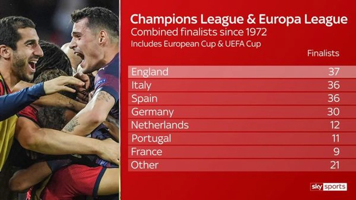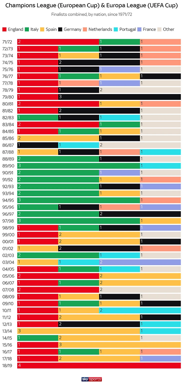 Этот сезон не просто стал лучшим в истории для англичан, но и плюс ко всему позволил им выйти на первое место по числу выходов в финал обеих еврокубков. С момента основания Кубка УЕФА в 1972-м году, английские команды 37 раз оказывались в финале, у Италии и Испании, которых родоначальники обошли в этом году, по 36 выходов. Плюс не забываем, что в момент расцвета английского клубного футбола, после трагедии на "Эйзеле" в 1985-м году, для английских клубов еврокубки оказались закрыты на 5 лет, а для "Ливерпуля" на 6 лет. Не случись этого, картину мы бы могли видеть несколько другую.