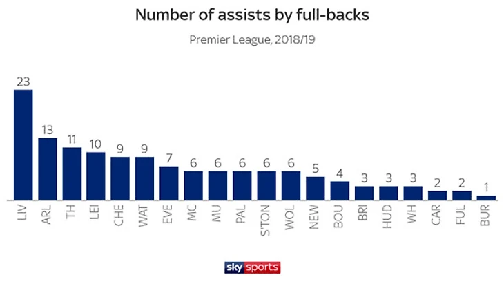 Огромный вклад в общую картину внес "Ливерпуль" Юргена Клоппа, чьи фулбеки сделали 23 передачи, в то время как главный преследователь "Арсенал" довольствовался лишь тринадцатью.