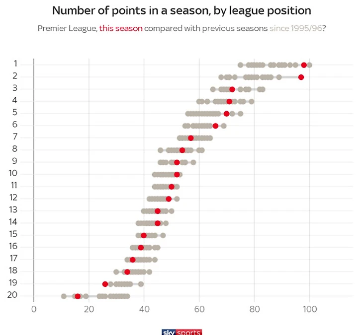 Это обусловлено не столько слабостью преследователей, сколько силой лидеров, "Сити" и "Ливерпуль" на двоих набрали 195 очков, тоже своеобразный рекорд.