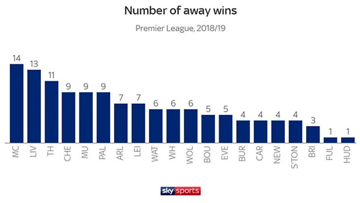 Сильнее всех в успех гостей вложились "Ман Сити" и "Ливерпуль" на счету которых 14 и 13 выездных побед соответственно. Хуже всех в этом плане были вылетевшие "Хаддерсфилд" и "Фулхэм", всего по одной выездной победе.