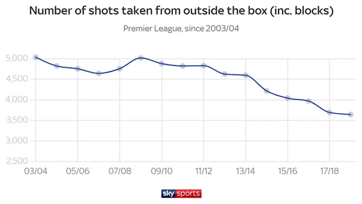 В этом сезоне зафиксировано наименьше количество дальних ударов за время ведения статистики. Тенденция снижения была заметна уже долгое время, но сейчас она достигла самой низкой точки. Всего 3644 попытки забить из-за пределов штрафной сделали футболисты АПЛ в этом сезоне, для сравнения, показатель сезона 2003/04 составлял 5038 ударов.