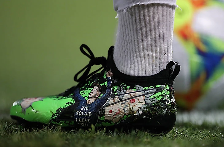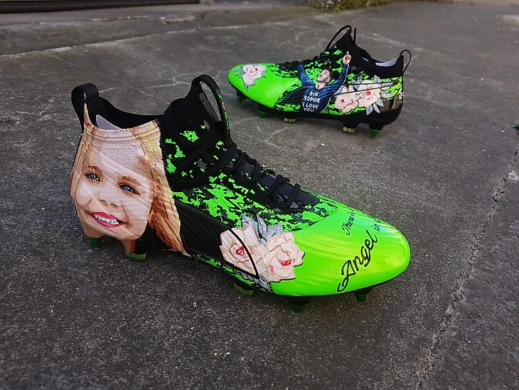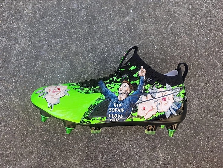 На левой бутсе нарисован Мэддисон в майке «RIP Sophy, I love you» («Покойся с миром, Софи, я люблю тебя»).
