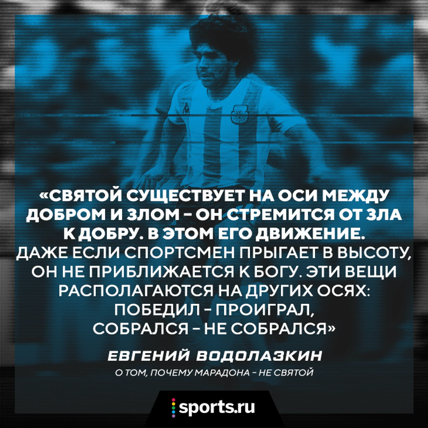 – Понимаете, святой существует на оси между добром и злом – он стремится от зла к добру. В этом его движение. Даже если футболист прыгает в высоту, он не приближается к Богу. Эти вещи располагаются на других осях: победил – проиграл, собрался – не собрался.