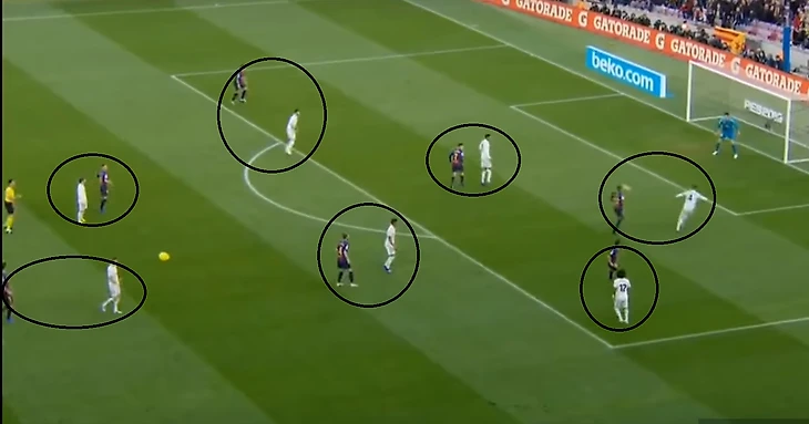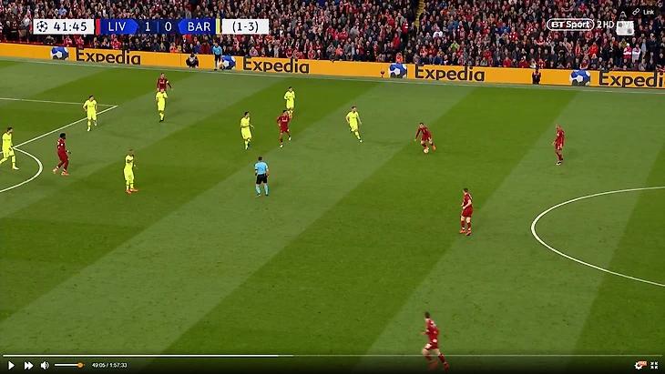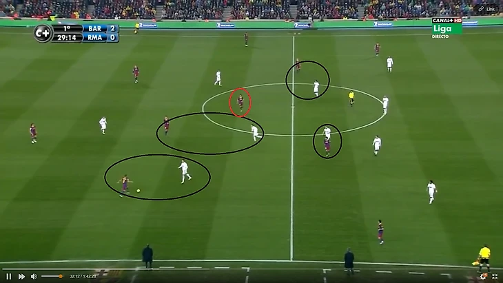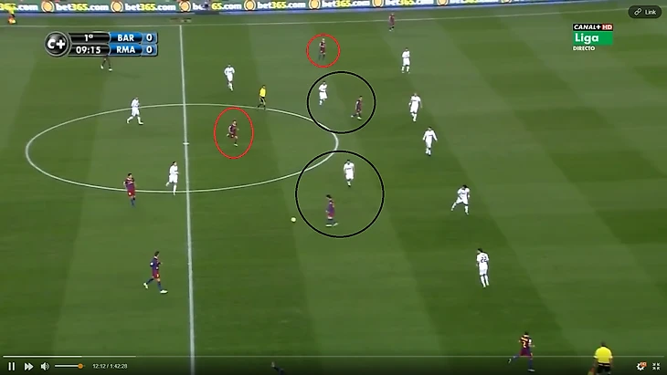(В этом кадре Суареза и Месси вообще нет, наверное закрывают потенциально опасный пас назад)