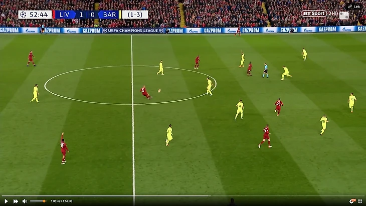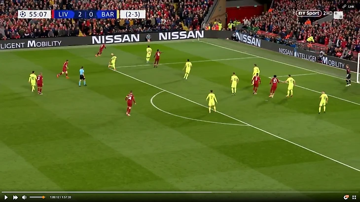 (Фабиньо полностью свободен. Бускетсу пришлось выдвинуться, что создает пространство сзади, которое Мане и Шакири атакуют. Фабиньо здесь выбирает лучший вариант с пасом на фланг)