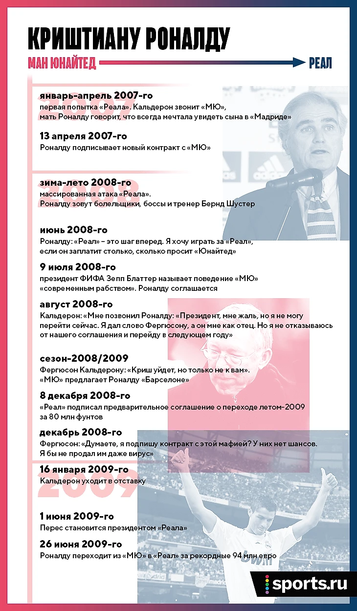 «Это был тяжелый момент. Мы вели переговоры по контракту, и я обсудил переход с Дэвидом Гиллом (директор «Юнайтед» в то время – Sports.ru). Он ответил, что Роналду не продается. Но сам Роналду хотел перейти», – рассказывал Кальдерон.