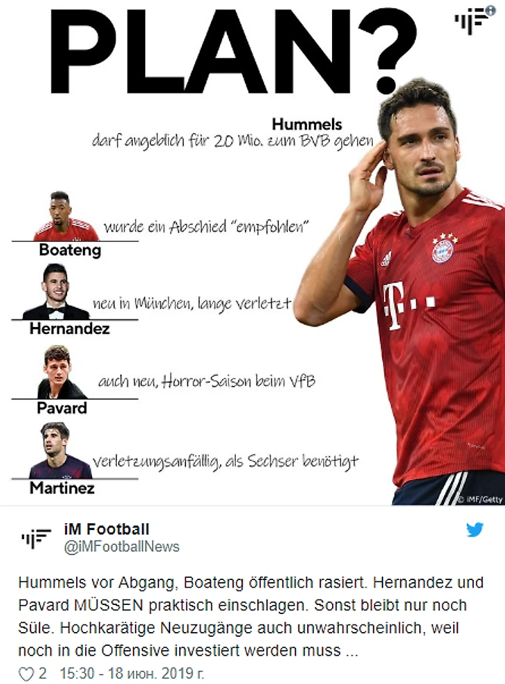 В некотором роде продажа Хуммельса вынужденная мера для "Баварии". Спрос на Боатенга очень низкий, а ставка делается теперь на других. И все же это не отменяет самого метода расставания. Недавно сообщили, что Матсу прямо заявили две недели назад, что основным игроком ему не быть. Так не делается. Уже второй раз клуб теряет Хуммельса по собственной воле и второй раз может об этом пожалеть.