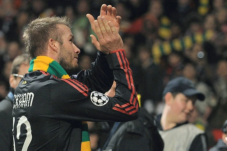 Шарф именно этой раскраски подобрал Дэвид Бэкхем в 2011 году, когда он с "Миланом" вернулся на Олд Траффорд и расплакался - тогда акция против Глейзеров набрала обороты, что символично, надо признать. Именно в этих цветах в качестве третьего комплекта футболисты МЮ выступали с 1992 по 1994, когда состоялся столетний юбилей.