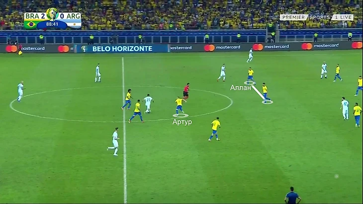 Аллан в отличие от Артура и Коутиньо хорошо оценивает ситуацию при обороне и реагирует на движение партнеров. Вот маленький пример – Артур выдвинулся, Аллан образует двойку с Каземиро: