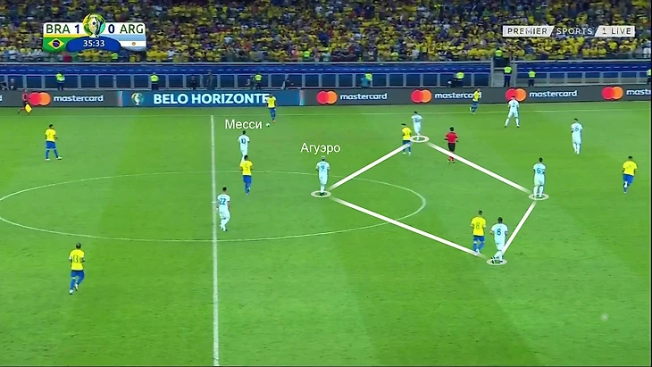 Логика проста: при обороне в 4-4-2 с ромбом пустуют фланги. Никто не играет против фланговых защитников – при смелых подключениях возникают проблемы. Против Катара и Венесуэлы Скалони готов был на такие риски (и то не все 90 минут). Против Бразилии – нет. Поэтому тренер выбрал гибрид – игроки из ромбовой схемы располагались в 4-2-3-1 (4-4-2, когда команда без мяча и садится глубже). Это вынудило Агуэро прикрывать правый фланг: