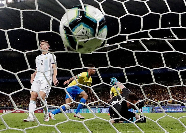 До первого гола: Бразилия играет первым номером и давит на соперника. Первый же удар в сторону ворот Аргентины завершается голом.