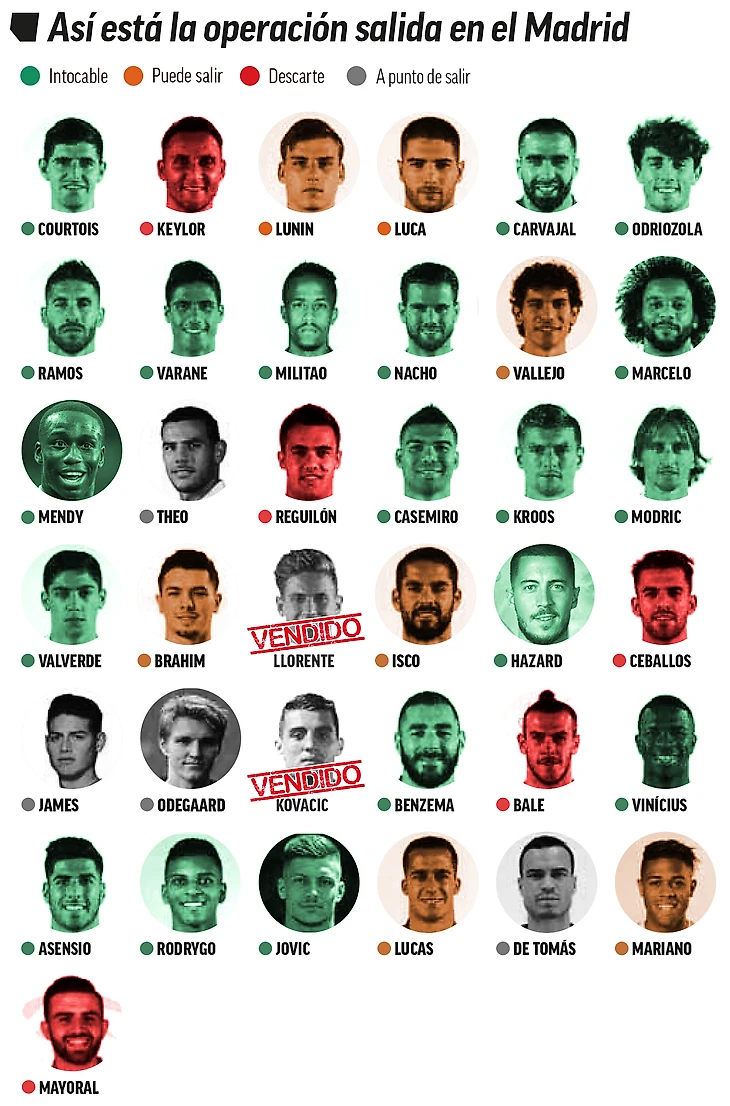 У " Реала " 37 игроков , которые входят в первую команду , но теперь из них осталось 35 футболистов , так как , Матео Ковачич и Маркос Льоренте перешли в другой клуб, " Сливочным " придется ещё расстаться с десяти футболистами , потому что по правилам ЛаЛиги, в 1 команде должно быть 25 игроков.