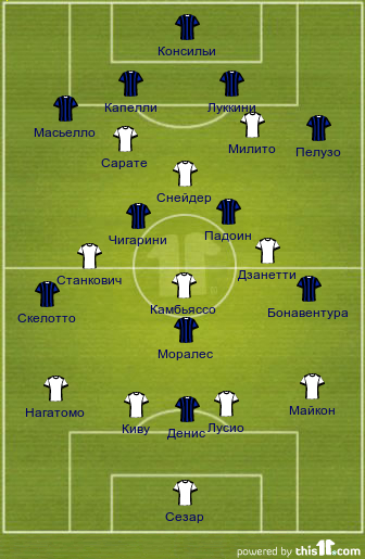 ИНТЕР: Сезар, Нагатомо, Киву, Лусио, Майкон, Станкович, Камбьяссо, Дзанетти, Снейдер, Сарате, Милито