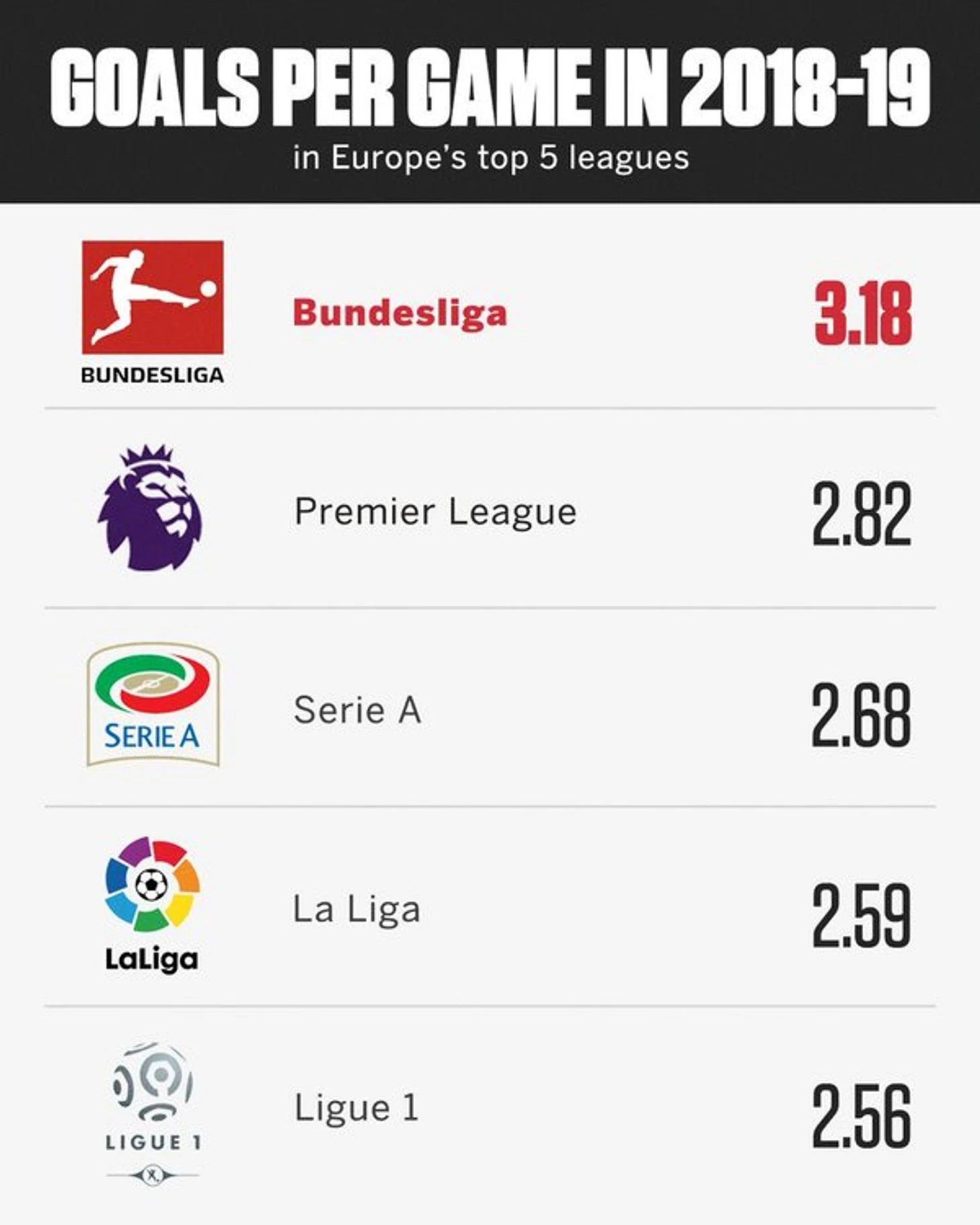 В немецкой Бундеслиге давно считалось, что если команда набрала 37 баллов – это уже гарантия сохранения места в элите. Но в прошедшей кампании "Аугсбург" смог остаться в Бундеслиге, набрав лишь 32 пункта, а в общей сложности целых шесть клубов не смогли набрать даже 37 очков. В общем же зачете Германия занимает вторую позицию, и располагается после Нидерландов – у немцев очень симпатичный показатель в 3.18 гола за матч.