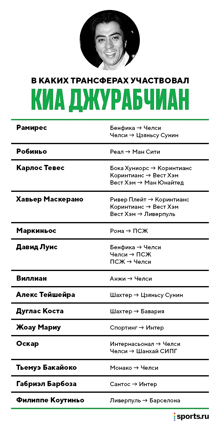 У трансферов Джурабчиана три общие черты: большие суммы, большие комиссии и большие провалы. Киа работает без агентской лицензии и поэтому не ограничен 10-процентным потолком ФИФА (правило, по которому комиссия агента не может превышать 10%), а свою работу оценивает очень дорого: в 2009-м боссы «Ман Сити» должны были заплатить за Кака 107 миллионов фунтов «Милану» и 28 – иранцу. И многие его трансферы почему-то не приносят большой пользы ни команде, ни игрокам.