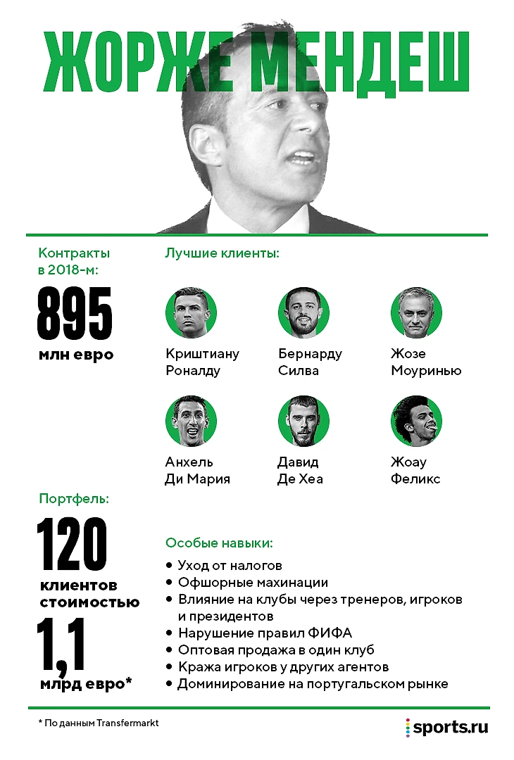 Сегодня Мендеш – самый влиятельный агент мира. У него лучшая клиентская база, самые большие связи и крупнейшие гонорары. Он подмял португальский рынок (в финале Лиги наций за Португалию сыграли 8 клиентов Жорже) и ворует звезд у других агентов (Моуринью у Байдека, Криша – у Вейги, Нани – у Алмейды, Феликса – у Кордейру).
