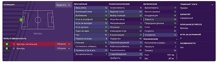 Для тех, кто не знаком близком с такой поистине затягивающей игрой, как Football Manager, дам небольшое пояснение: Роль Вратраь-чистильщик, закрашенная ядерно-зелёным цветом, говорит о том, что Зак умеет, как отбивать мячи, так и неплохо играть ногами, он тактически обучен играть в данной роли. Грубо говоря Стеффен может действовать в стиле Нойера, Эдэрсона, Тэр Штэгена, Аллисона и т.д. Для своих 22х лет он имеет очень неплохие показатели в плане вратарских навыком, особенно можно отметить игру 1на1, реакцию, ловкость, игру в штрафной.