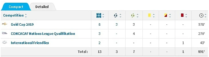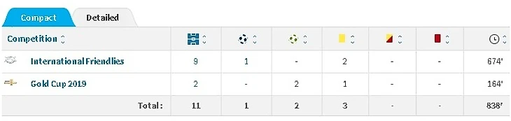 В национальной сборной у нашего героя тоже полный порядок, с 2017 года 13 матчей за основную сборную, при том всего 2 товарищеских, 3 гола и 3 голевые на Золотом Кубке 2019 года, плюс 4 голевые в 3-х матчах квалификации Лиги КОНКАКАФ, очень достойные показатели для 17-три летнего парня.