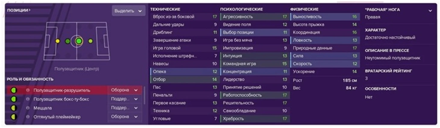 Агрессивность, работоспособность, храбрость 17/20, координация, выносливость 16/20, аналитика от бога подъехала. Командная игра 15/20, ещё не дурно бросает мяч руками – 17/20 выбросы аута. Игрок понимающий футбол и выполняющий большой по объему функционал в центре поля. Может сыграть как центрального полузащитника бокс-ту-бокс, так и опорного полузащитника.