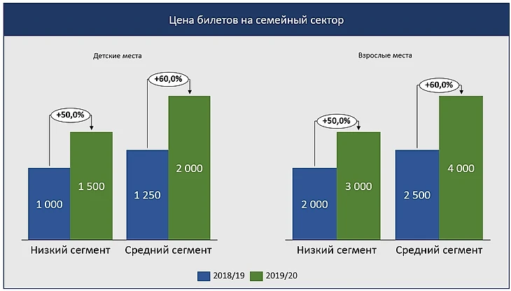 Особенно на 8 секторе заметна разница. На остальных секторах разницы в дельте цен между низким и средним ценовыми сегментами особой нет, на верхнем ярусе 7 сектора разрыв даже сократился по сравнению с сезоном 2018/19.