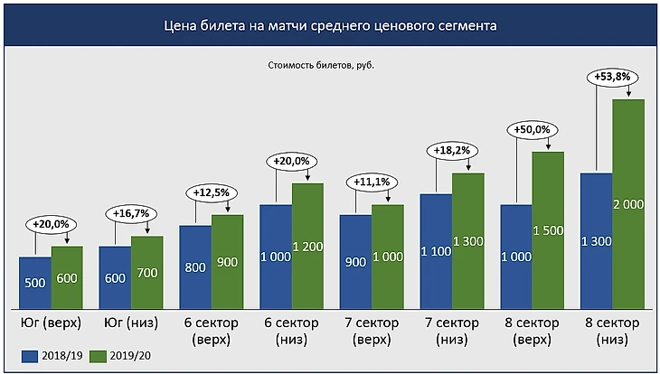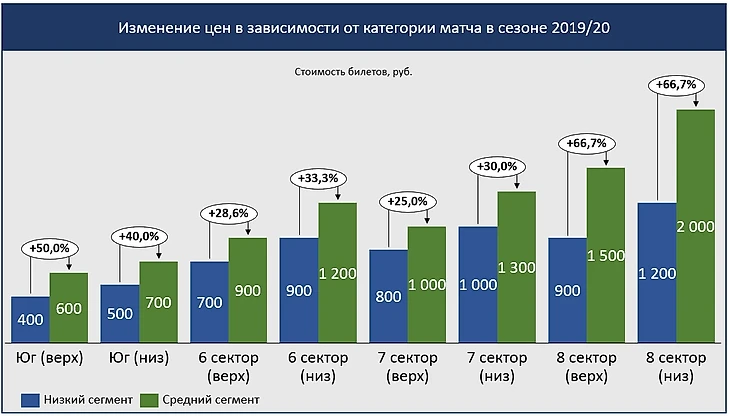 Теперь вернемся к прошлому году. Билеты делились на 3 категории: низкий, средний и высокий ценовые сегменты. В средний ценовой сегмент были включены команды вроде Динамо и Краснодара, а команды вроде Ростова были в низком ценовом сегменте. Самые высокие цены были на ЦСКА и Зенит, ну и совсем отдельная ценовая политика была на матч со Спартаком.